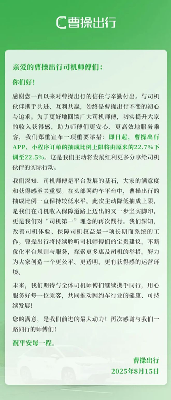 8月15日,曹操出行公告稱,即日起,平台訂單抽成比例上限從22.7%下調至22.5%。