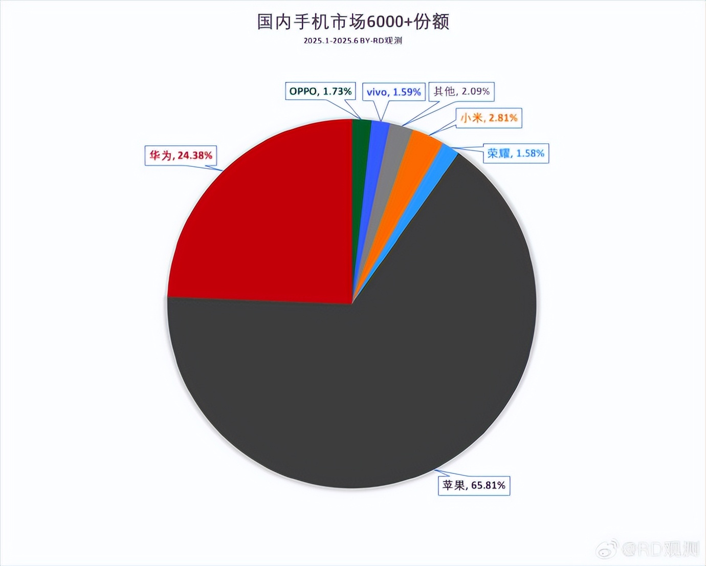 不過,目前幾乎所有手機廠商都在打高端市場的主意,根據知名爆料博主“RD觀測”數據, 2025年上半年國內6000+高端手機市場份額排名,蘋果與華為合計佔據九成以上份額,小米手機要實現“躍級”發展,並不是簡單的事情。