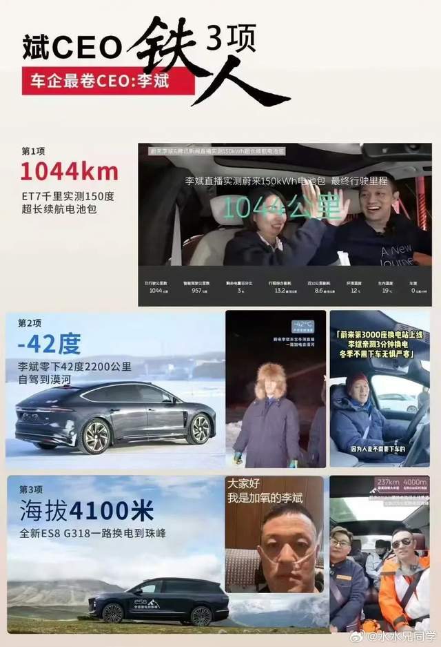 2023年12月,李斌測試搭載150度電池包的蔚來ET7的實際續航里程,一共開了1044公里耗時14小時;2025年1月,李斌駕駛蔚來ET9從大連出發,花了4天把車開到了零下42攝氏度的漠河北極村;2025年7月,李斌把蔚來ES8帶到了海拔4100米的珠峯大本營。