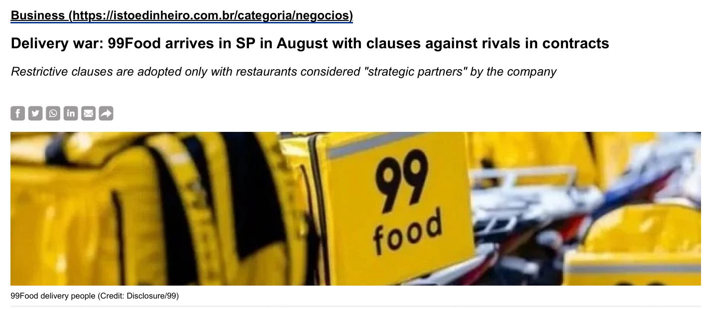 據巴西自媒體作者(餐飲諮詢公司經營者)爆料,自己有客户收到滴滴99Food開出600萬雷爾(近800萬元人民幣)報價,要求“半獨家”,不得與美團/Keeta合作,但可繼續與iFood合作。無獨有偶,巴西媒體《Globo》報道也證實,滴滴99Food在巴西向商户開出數百萬雷爾(1雷爾≈1.3元人民幣)報價,要求禁止與美團/Keeta合作,但可繼續與iFood合作。