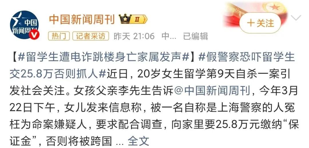 一個剛去馬來西亞留學9天的20歲女孩子,因為遭遇電信詐騙,精神崩潰,在學校裏跳樓身亡。