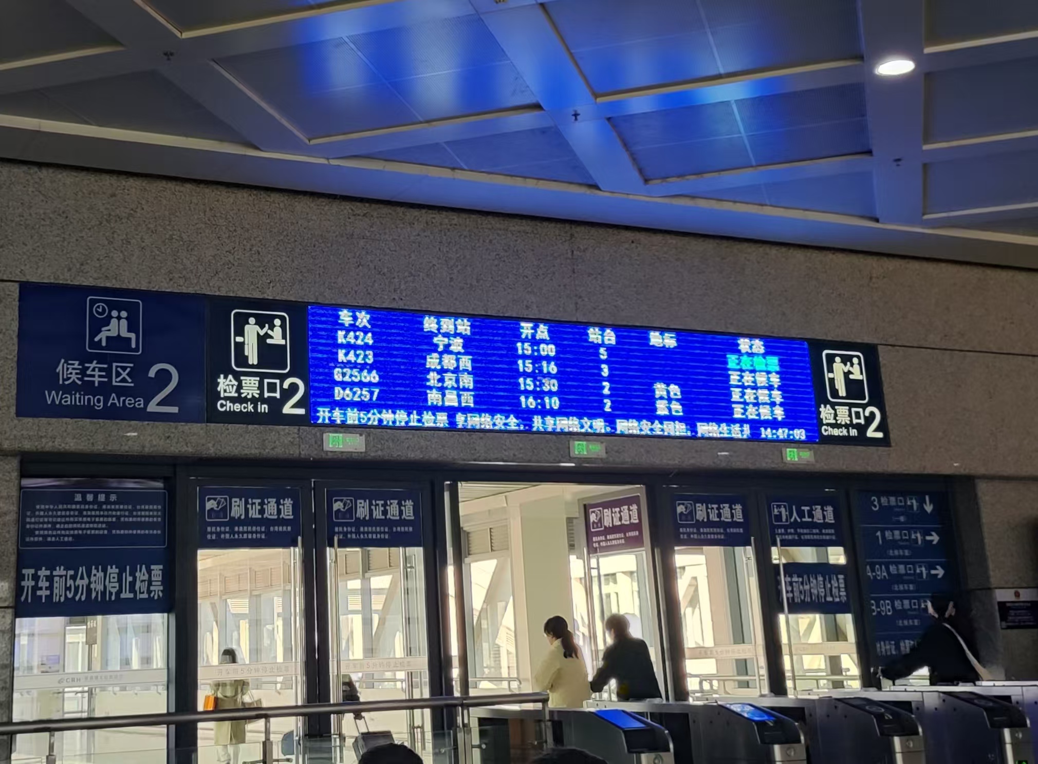 抵達升級後的景德鎮北站,其結構佈局堪稱不同年代版本車站的“複合體”。北廣場是現代流行的騎跨式候車室,南廣場則保留了傳統候車室的樣式。旅客需要看清檢票口指示,前往對應的候車室,以免耽誤行程。由於先期通車的九景衢鐵路是客貨混線,景德鎮北站還兼具普鐵和貨運功能,這一點從車站屏顯信息也能看出端倪。