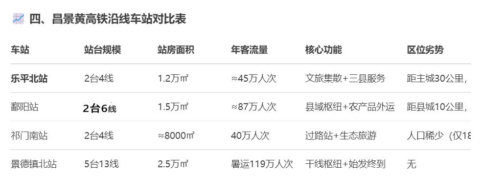忽然對這段高鐵通車後的運營狀況產生了濃厚興趣,特意在Deepseek上查詢了沿線幾個車站的流量表現,如景德鎮北站、樂平北站、鄱陽站等。查詢結果有些意外:在昌景黃高鐵沿線新建車站中,景德鎮北站的客流量目前表現頗為亮眼,僅次於南昌西站、上饒站等大型樞紐!九景衢鐵路讓景德鎮邁入高鐵時代,而昌景黃高鐵通車加持則使其躍升為區域性的樞紐。這背後,自然也離不開當地政府的投入與推廣,當然,千年瓷都深厚的底藴和吸引力那都是重要基礎。