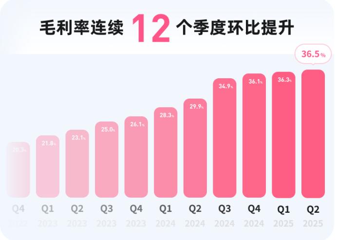 其次,本季度毛利率從去年同期的29.9%,提升至36.5%,已經連續 12 個季度實現環比上漲。B站在業績會上預計,到4季度將達到37%水平,未來將看到40-50%的毛利率目標。