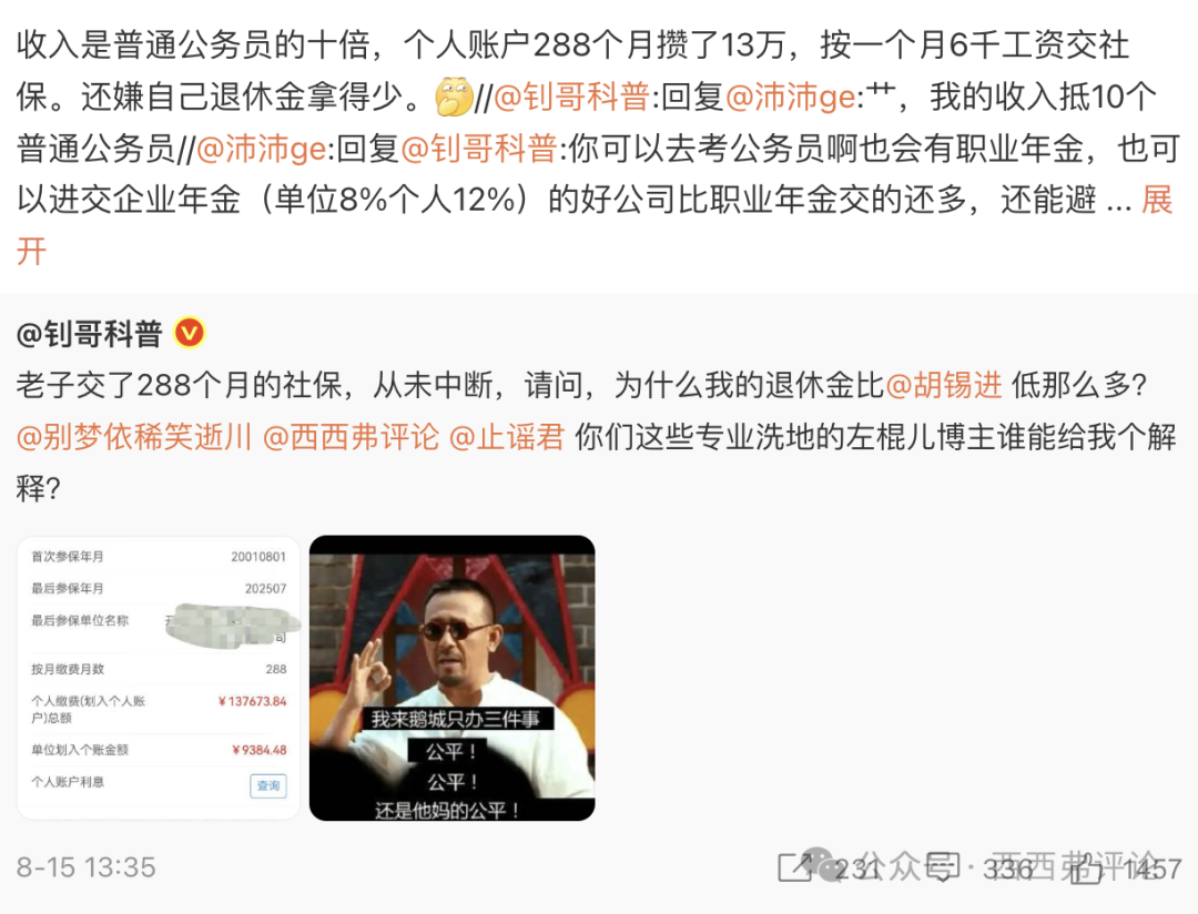 工資是普通公務員的十倍,繳納社保按最低基數(社平的60%),從來沒繳納過企業年金。這就是典型的佔社保便宜行為。當然,佔便宜就佔便宜了,很多高薪階層都按最低基數繳。但佔了便宜,卻又抱怨退休金低。