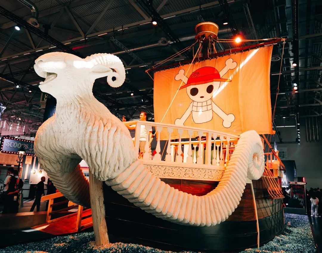 這裏補充個背景,那就是Gamescom不同於國內遊戲展,對於廠商展位搭建的高度限制很寬鬆,所以每年現場的“巨物奇觀”造景都特別多。比如跟鷹角在同一個展廳的《海賊王》真人電視劇,就是搬了艘少説也有1:3還原的“黃金號梅麗號“來。