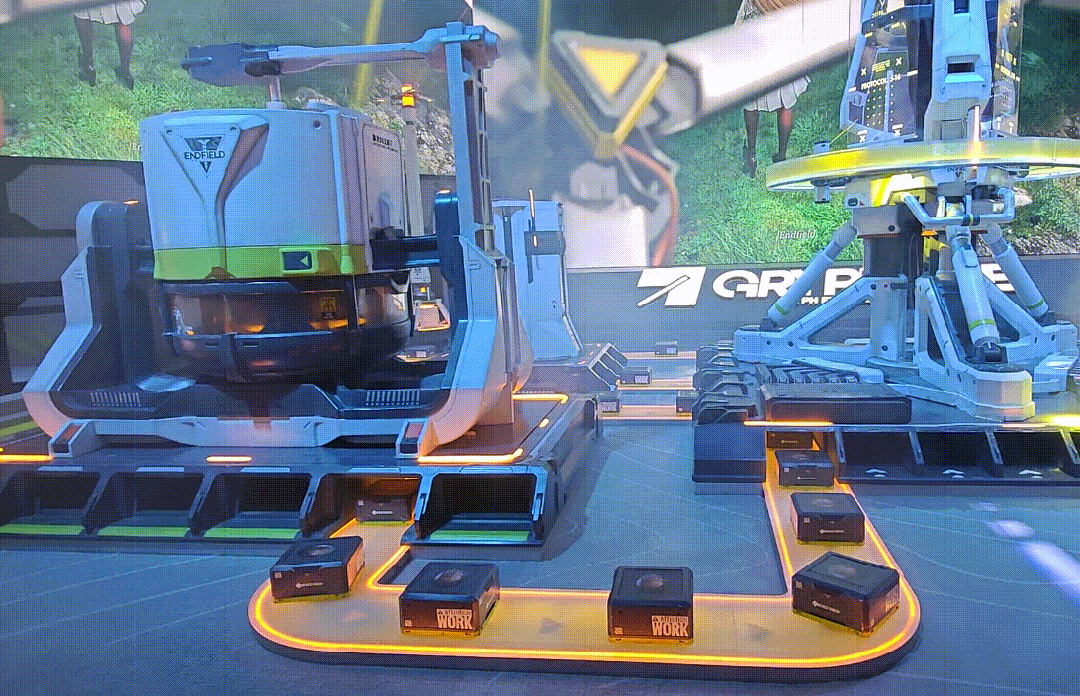 這次科隆展上終末地的展位,在現場重現了一套“集成工業”裝置。不斷運轉的傳送帶上,貨物每經過一個加工點,盒子表面的標籤也會相應地發生變化: