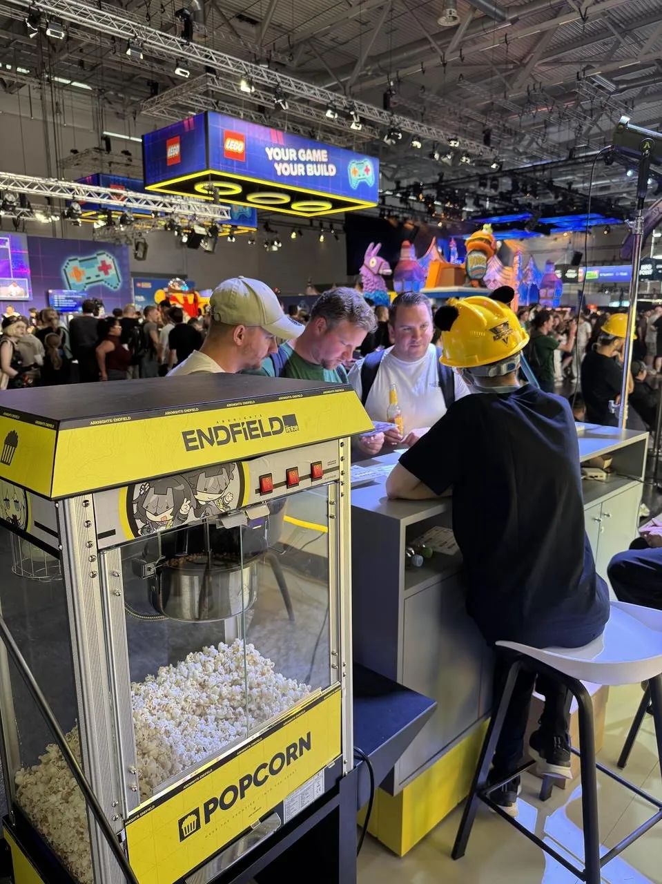 恰好鷹角還在展位邊上放了個爆米花機,向路過觀眾免費發放,也在邏輯上形成了一個類似遊戲當中流水線生產的閉環:自動化基建 - 種植採集 - 輸入原材料 - 加工生產 - 成品製造……