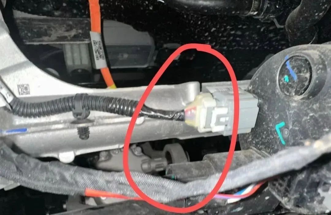 有車主向記者展示了不同類型的對比圖片:打膠款是在線束的接口處打上一層白色膠體,以起到臨時密封的作用,而最新的小鵬P7+則將原來的白色接口總成換成了黑色總成。