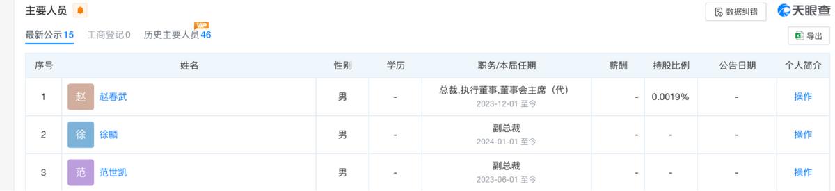 天眼查APP公司主要人員顯示,目前趙春武已代任公司董事會主席。