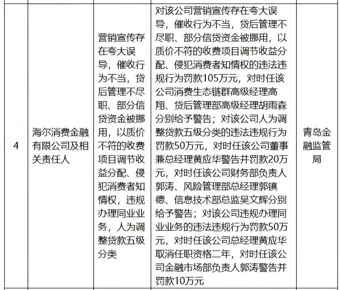 7月22日,青島金融監管局披露的罰單顯示,海爾消費金融因多項違法違規行為被合計罰款205萬元。6名高管被警告、罰款。