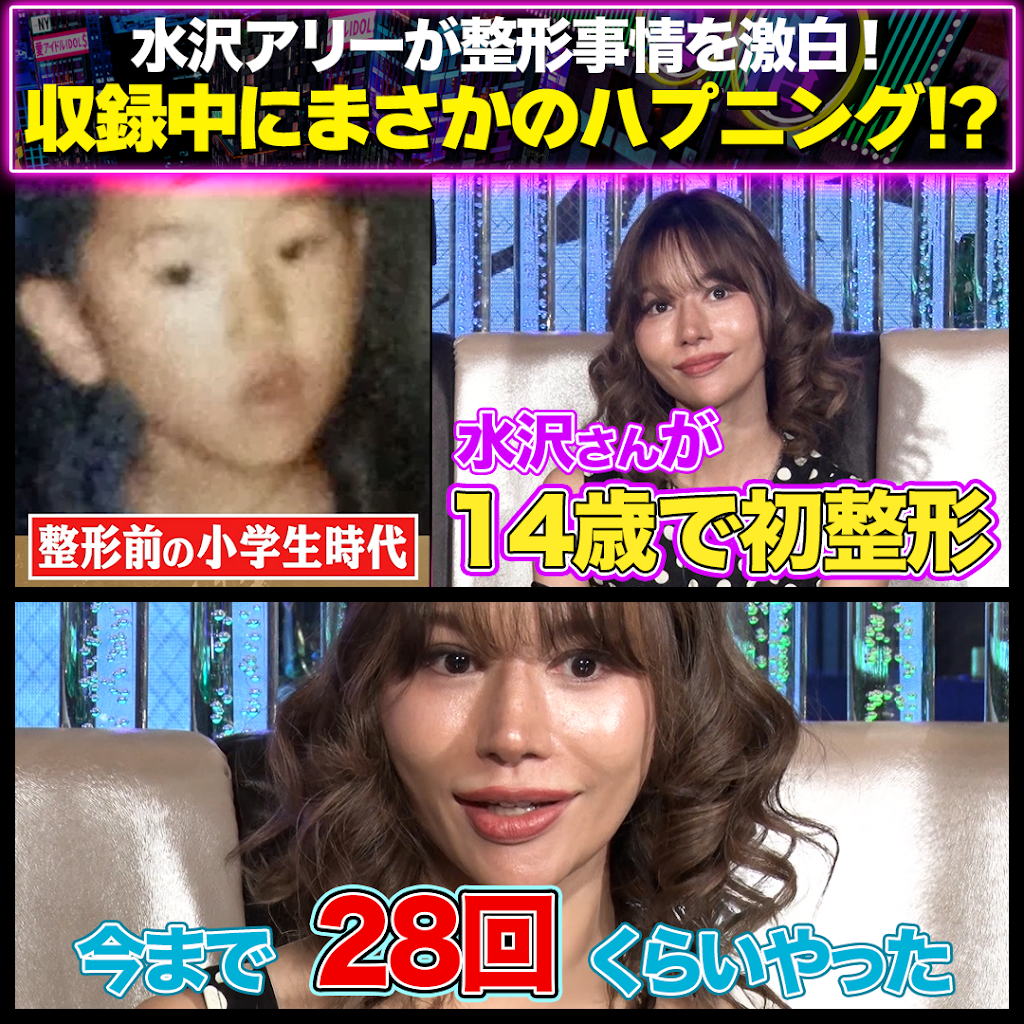 2016年,水沢在全切雙眼皮術後尚未消腫時,硬上了綜藝節目《しゃべくり007》。節目播出後,網上狂刷“眼皮腫到像香腸”“整形穿幫”等,原定通告全部取消,一時間,水沢幾乎被迫“隱退”。