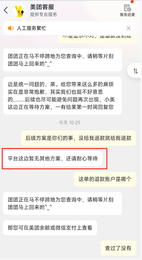 但涉及消費者自身利益,目前暫時不能只期望於等商家查,還是先自查,不能信任美團頁面上所謂的退款成功。