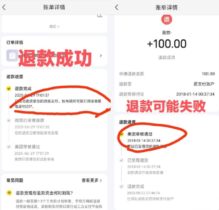 以後,咱們消費者也應該留個心眼。不僅僅是美團,其他平台也是一樣,光看頁面上“退款成功”幾個字是不夠的,還是要對仔細核對實際到賬情況。