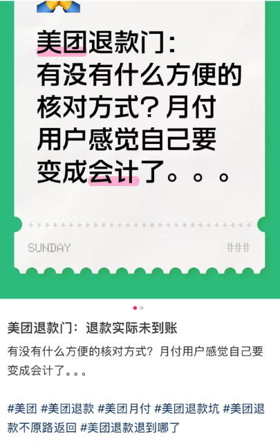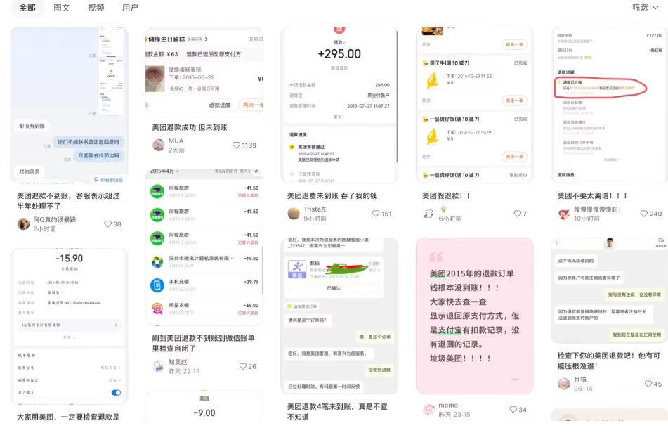 事情的起因是,有用户在社交平台發帖吐槽美團退款有問題。明明頁面顯示退款成功,銀行卡、支付寶或微信卻遲遲未見款項到賬。