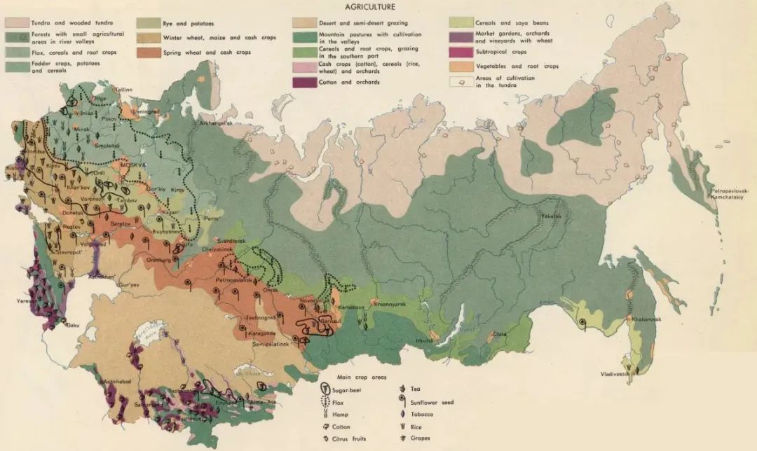 而蘇聯的耕地中適合種植穀物的就更少了。冬小麥種植區擠在國土西南部,春小麥的分佈區為從伏爾加河延伸到新西伯利亞的狹長地帶。