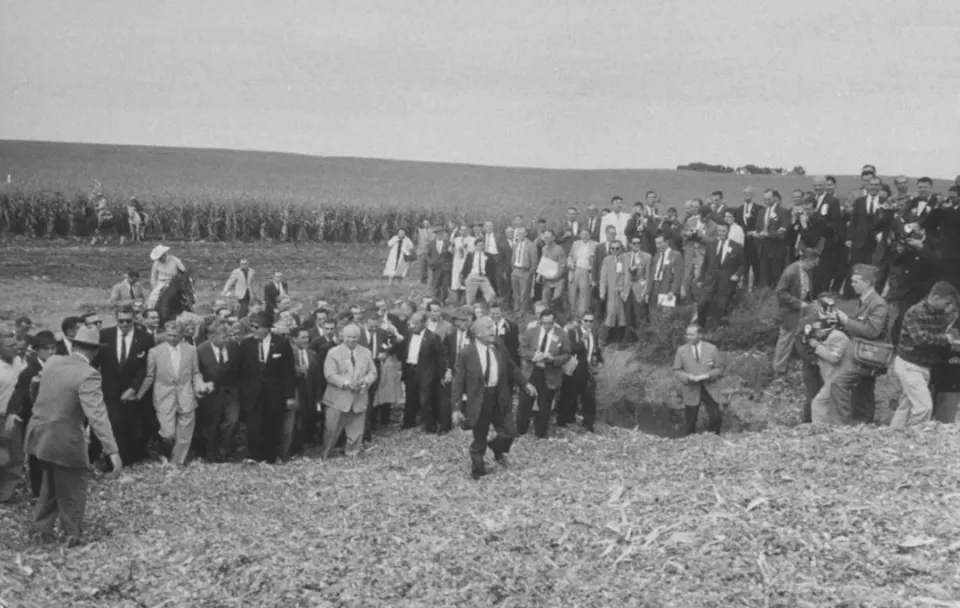 正在參觀美國加斯特農場的赫魯曉夫團隊,背景是一望無際的玉米地