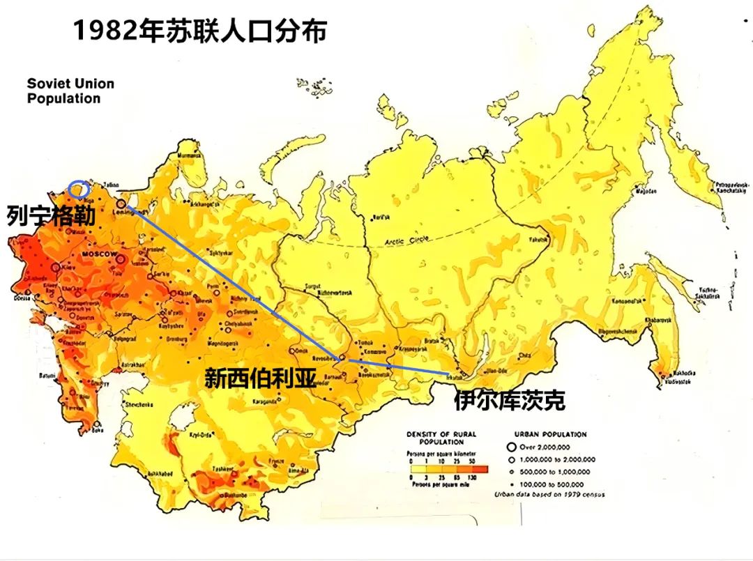 蘇聯國土面積雖然很龐大,但是大部分不適宜居住。蘇聯的人口分佈集中在列寧格勒(今聖彼得堡)-新西伯利亞-伊爾庫茨克一線以西地區。