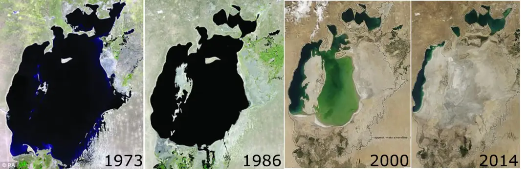 例如,為了種植棉花,截流阿姆河和錫爾河灌溉農田。導致流入鹹海的水量大量減少,鹹海面積縮小了90%。至今湖底乾涸後產生的鹽塵暴仍然在困擾哈薩克斯坦和烏茲別克斯坦。