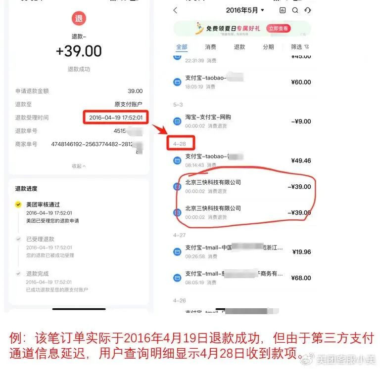 二、極少部分訂單顯示“退款失敗”,主要是原支付渠道出現問題,美團已提供兜底方案。