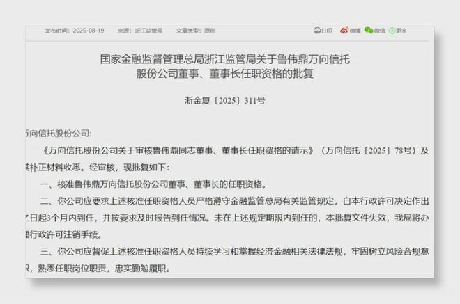 8月19日晚間,一則重磅消息在金融界掀起波瀾。國家金融監督管理總局浙江監管局發佈批覆公告,正式核准魯偉鼎出任萬向信託董事、董事長的任職資格。這一決定標誌着,時隔13年,萬向信託的“掌門人”迎來關鍵更替,魯偉鼎將肩負起引領萬向信託未來發展的重任。