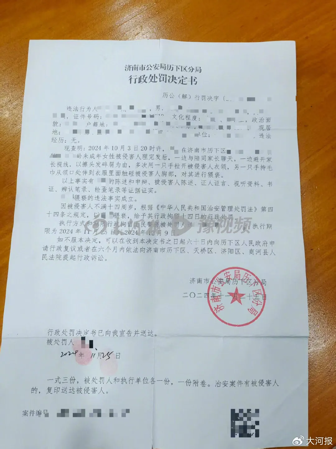 2024年11月25日,濟南公安局歷下區分局對張泉做出行政處罰。