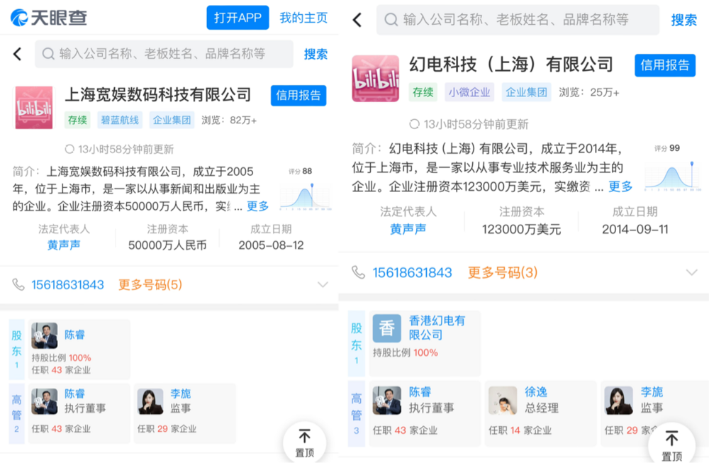 從工商信息來看,上海寬娛作為B站最核心的運營實體,變更後陳睿仍持有該公司100%股權,但不再擔任法定代表人和執行董事。幻電科技則由香港幻電有限公司全資控股,專注於手遊業務,陳睿不僅卸任職務且完全退出持股,標誌着對這一板塊的徹底放手。