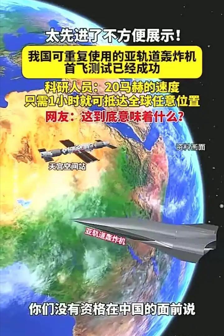 據外媒透露,中國成功研製並試飛的亞軌道轟炸機,是一種能夠在高空中以20倍音速飛行,並且在一小時內抵達全球任何地方的超級武器。