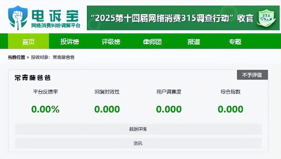 2025年至今,“電訴寶”受理投訴中涉及的數字教育領域用户有效投訴顯示(依據投訴量排行),“常青藤爸爸”排名第6位。最新評級為**“不予評級”**。除此之外,其他被投訴的類似平台還有:中安建培、一隻船教育、尚德機構、幫考網、賽優教育、常青藤爸爸、嗨學網、對啊網、潭州教育、網易雲課堂、滬江網校、幫考教育、正保會計網校、恆企教育、VIPKID、英語流利説、中職通、環球網校、深海教育、聚力成師教育、小葉子陪練、高教通、中公教育、阿卡索外教網、明世在線、大鵬教育、掌門1對1、芸學教育、眾趣教育、騰訊課堂、51Talk、菲爾萊。