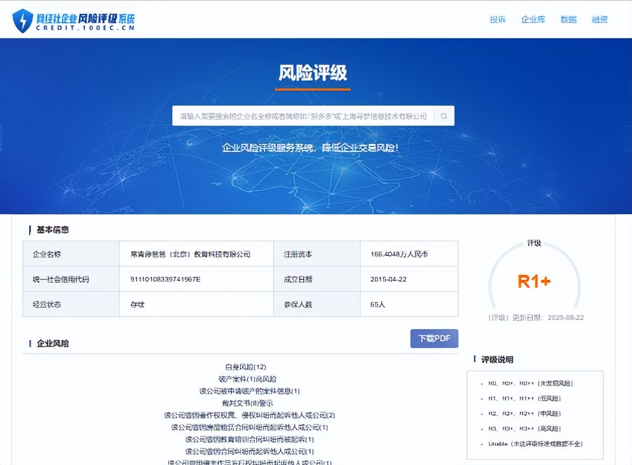 據網經社“企業風險評級系統”顯示,“常青藤爸爸”所屬常青藤爸爸(北京)教育科技有限公司,風險評級為R1+,目前公司處於低風險。