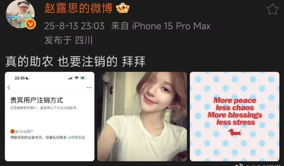 8月13日晚,演員趙露思宣佈將註銷微博,坐擁3117萬粉絲的95後女星趙露思,以一句“真的助農,也要註銷的,拜拜”宣告從微博正式退場。8月19日,其賬號顯示無法查看狀態。這一行為並非明星一時興起的“情緒宣泄”,而是撕開了社交平台與經紀公司、資本方深層關聯的口子。