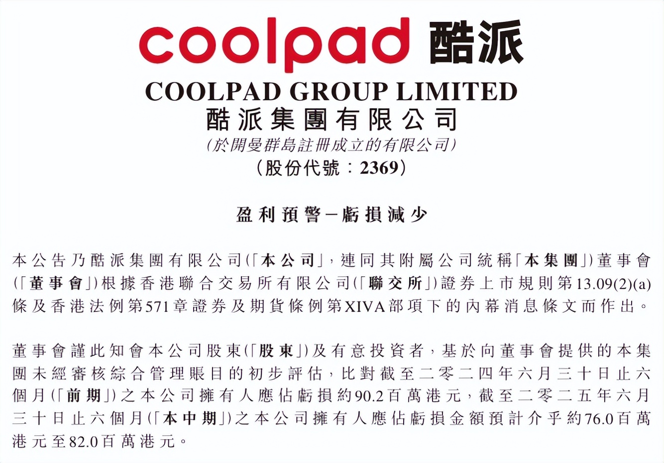 近日,酷派集團發佈半年公告,預計2025年上半年公司擁有人應占虧損約為7600萬至8200萬港元。這一虧損幅度較2024年同期的9020萬港元有所收窄。