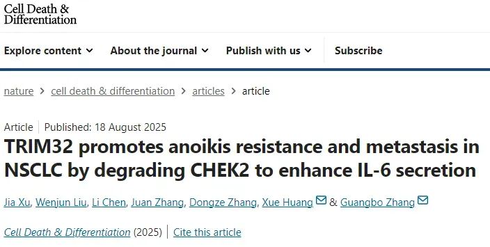 轉移顯著導致非小細胞肺癌(NSCLC)高死亡率,失巢凋亡抵抗在此過程中發揮關鍵作用。然而,TRIM32 在失巢凋亡抵抗及轉移中的作用尚未明確。2025年8月18日,蘇州大學張光波、Huang Xue共同通訊在cell death & differentiation上在線發表題為“TRIM32 promotes anoikis resistance and metastasis in NSCLC by degrading CHEK2 to enhance IL-6 secretion”的研究論文。該研究證實,TRIM32可增強非小細胞肺癌的失巢凋亡抵抗能力與轉移能力。研究驗證了TRIM32與CHEK2之間存在相互作用,並發現TRIM32通過K48連接的多聚泛素化介導CHEK2的降解。體外與體內實驗結果均表明,CHEK2可抑制非小細胞肺癌的失巢凋亡抵抗與轉移。此外,研究發現TRIM32能上調IL-6的表達,而CHEK2的過表達可逆轉該效應。進一步分析證實,IL-6在TRIM32介導的失巢凋亡抵抗與轉移中發揮關鍵作用。值得注意的是,在伴有淋巴結轉移的非小細胞肺癌組織中,TRIM32陽性(TRIM32+)、CHEK2陰性(CHEK2-)、IL-6陽性(IL-6+)的腫瘤細胞更為常見。綜上,該研究結果提示,通過CHEK2/IL-6軸靶向TRIM32以抑制失巢凋亡抵抗與轉移,或可為轉移性非小細胞肺癌的治療提供一種新型策略。