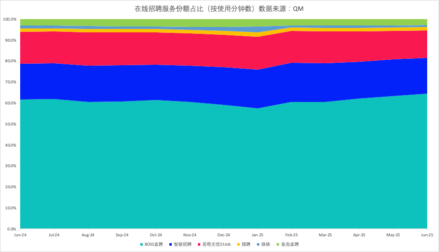 其中排名第一的BOSS直聘,佔比從2025年4月的62%,提升至2025年6月的64.5%。