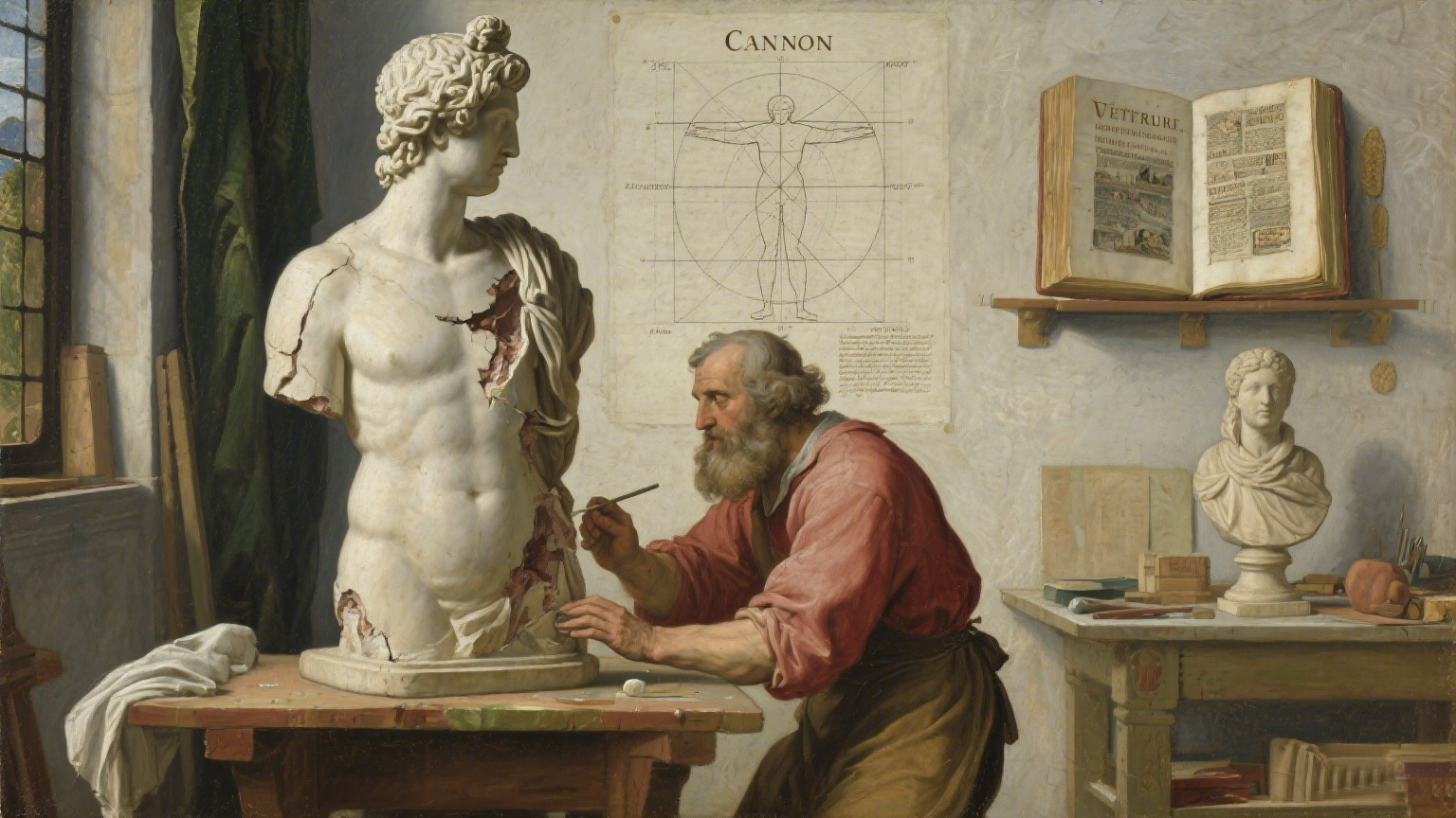 美術史專業會認為那是 Polykleitos 的《 Canon》(《法則》)在起作用,並非缺乏個體差異。但 《 Canon》本身最早的文字描述來自公元 2 世紀盧奇安,距所謂公元前 5 世紀已有 600 年以上;且 《 Canon》 原文已佚,後世全靠文藝復興學者 “重建”。換言之,我們今天拿來當 “古典規範” 的,恰是文藝復興人自己寫給自己的模板。古希臘雕塑中這種過於統一的肌肉結構表現,並不符合真實人體的實際情況,更像是後世偽造者在缺乏對真實人體多樣性瞭解的情況下,採用了一套標準化的模板來進行創作。這種標準化的創作方式雖然能夠在一定程度上營造出一種理想化的美感,但卻掩蓋了人體的真實特徵,也使得這些雕塑的真實性受到質疑。
