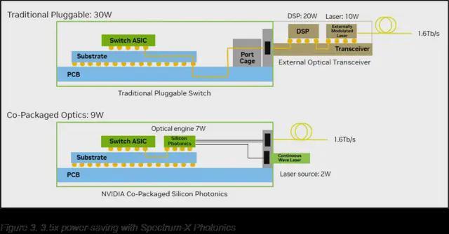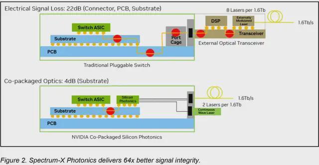在這種環境下使用可插拔光模塊存在明顯的侷限性:此類設計中的數據信號離開ASIC,穿過電路板和連接器,然後才轉換為光信號。這種方法會產生嚴重的電損耗,在200 Gb/s通道上損耗高達約22分貝,這需要使用複雜處理進行補償,並將每個端口的功耗增加到30W(這又需要額外的冷卻並造成潛在的故障點)。據英偉達稱,隨着AI部署規模的擴大,這種損耗幾乎變得難以承受。
