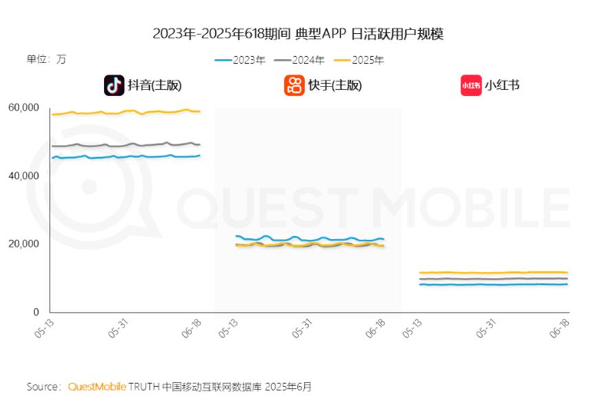 不過遺憾的是,佈局電商業務十餘年,小紅書仍未成為中國重量級的電商平台。QuestMobile披露的《2025年618洞察報告》顯示,2023年-2025年各年618,小紅書的月活僅為1億左右,遠低於淘寶、拼多多、抖音等平台。