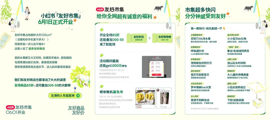 2025年6月1日,小紅書電商“友好市集”開業,符合“商品友好、服務友好、價格也友好”理念的商家可報名入選。小紅書將為入選的優質商品提供超10億社區流量傾斜,並提供“友好市集”專屬標籤。