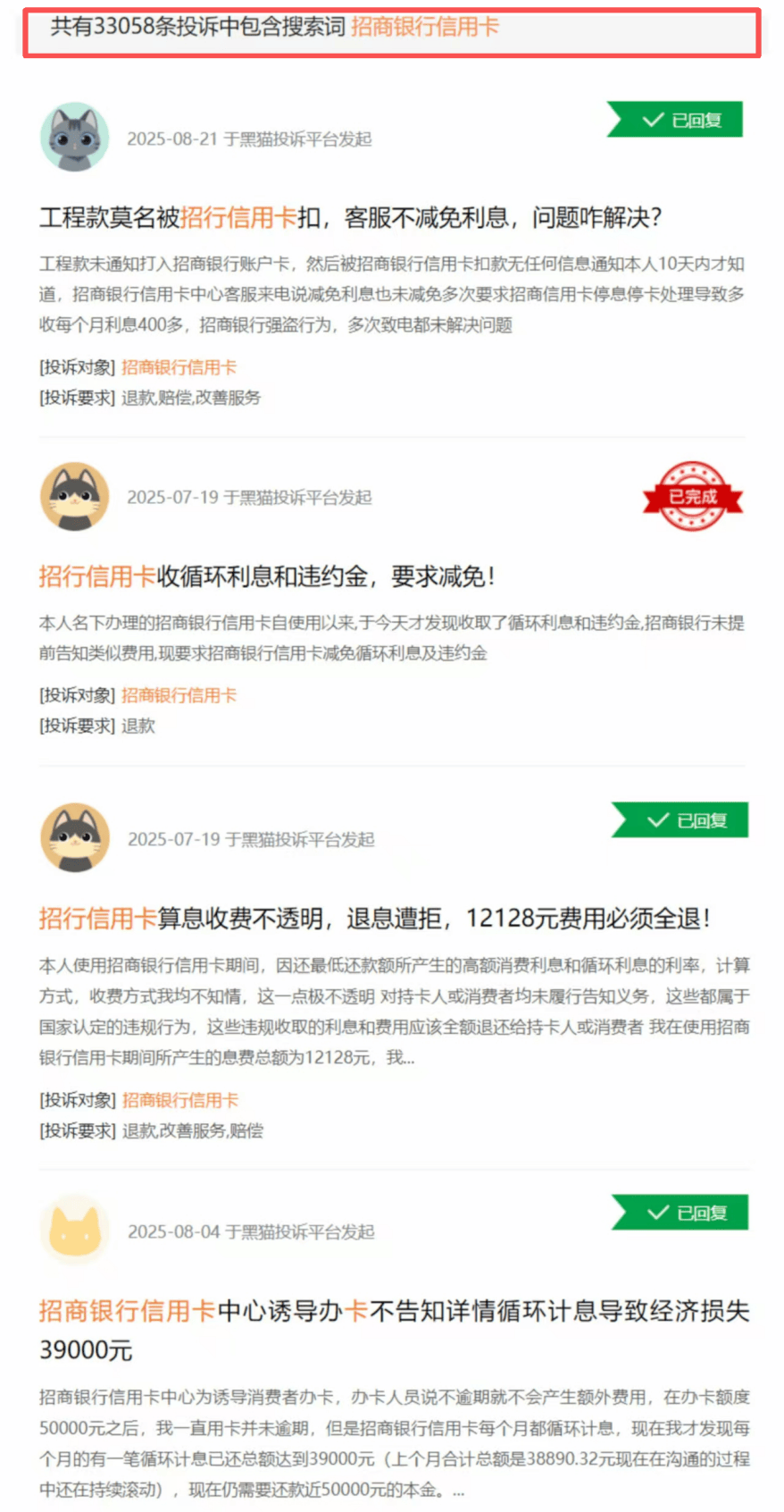 黑貓投訴平台上,輸入“招商銀行信用卡”關鍵詞,出來的詞條高達33000多條,在同業賽道遙遙領先,投訴集中在隨意扣款、欺詐消費、息費過高、暴力電催、虛假宣傳等問題。