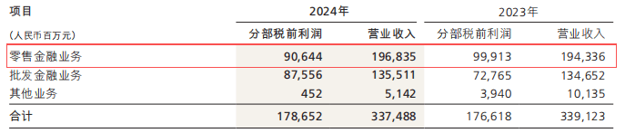 2024年,招商銀行零售分部錄得收入1968.35億元,同比微增1.29%,但税前利潤卻背道而馳,同比下降9.28%至906.44億元,相當於一年少賺約93億元。