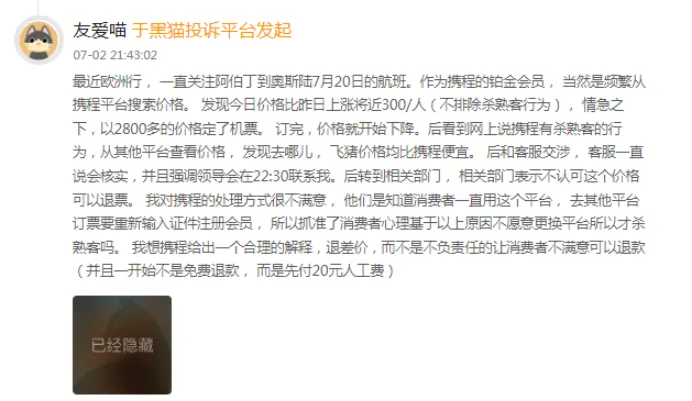 以機票退改簽為例,有用户表示,自己曾在攜程上購買了一張從阿拉伯到奧斯陸機票,連續幾天發現機票價格不間斷上漲,最大差價接近300元,不得已花費2800元購買了機票。但在購買後,發現價格瞬間下降,並且對比其他平台均比攜程都便宜,讓他懷疑自己被大數據殺熟了。即便後續與客服交涉,也不了了之,對攜程失望至極。