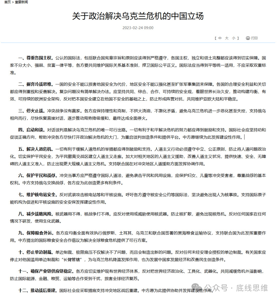 2023年2月24日,中方發佈關於政治解決烏克蘭危機的12點立場聲明(外交部網站)
