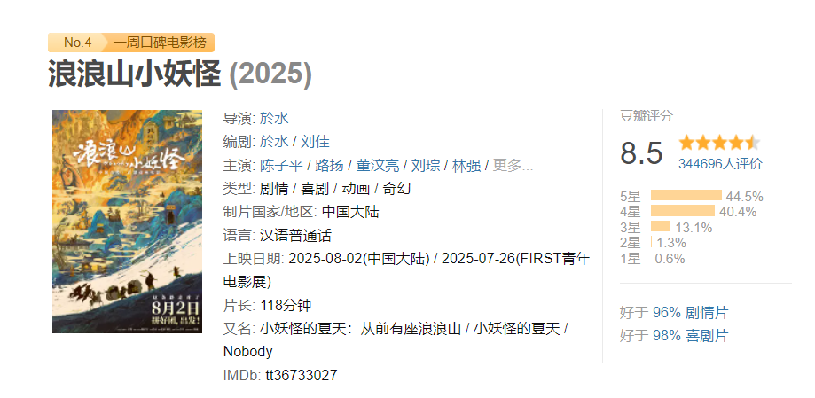 比如,最近這部《浪浪山》,豆瓣評分也是極高的,甚至都超過《哪吒2》了(當然,目前打分人數只有34萬,比起哪吒2超過144萬打分人數還太少,等人數超過100萬評分肯定會下降)