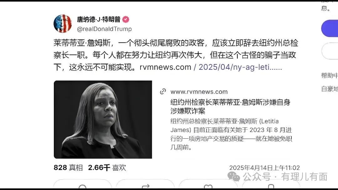 《紐約郵報》獲得的內部文件顯示,調查內容包括詹姆斯辦公室是否“非法獲取特朗普的税務記錄”“是否接受外部資金干預調查”——但這些指控,跟當年詹姆斯調查特朗普的理由幾乎一模一樣,被媒體稱為“以彼之道還施彼身”的拙劣模仿。