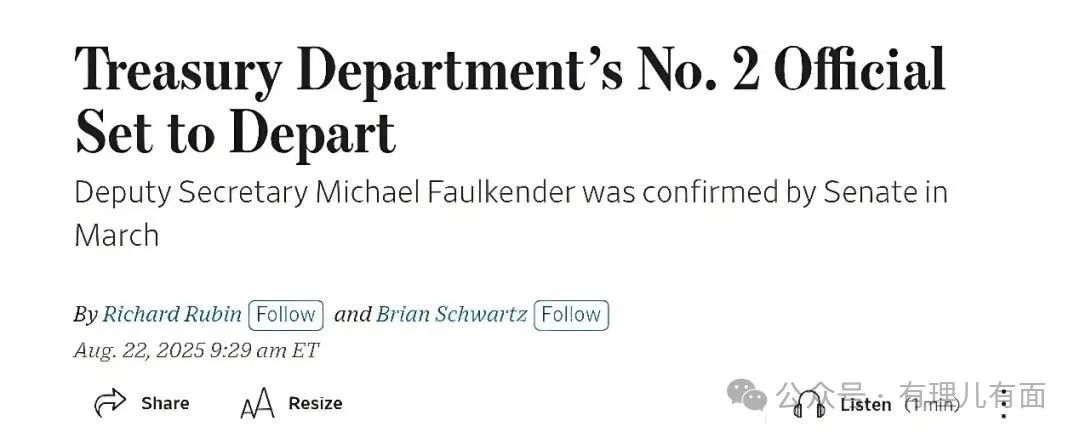 8月21日,福爾肯德提交辭呈,財政部發的聲明裏隻字不提離職原因,只乾巴巴地説“感謝其服務”——這種“此地無銀三百兩”的操作,在美國政壇早就成了“被迫離職”的標配。