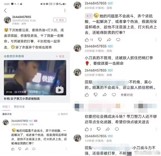 事情發生後有部分網友發表不合時宜的言語,其中一些言語已經相當過激。其中一名網名“26468457855”的網友表示:“下次她要注意,要換熱油+打火機,或者濃硫酸,傷害性更強,幹了就要一擊斃命。與其被男的打拳,不如把他一起帶走,而穿了衣服弄個傷殘也簡單。她的問題是不會戰鬥,弄個濃硫酸,一起解決了,或者拿個熱油,假裝用保温杯喝水,趁他不注意潑上去,打火機點上去,還輪得到男的打拳? 小刀真的不管用,還被敵人抓住把柄打拳,要做就要一擊斃命”