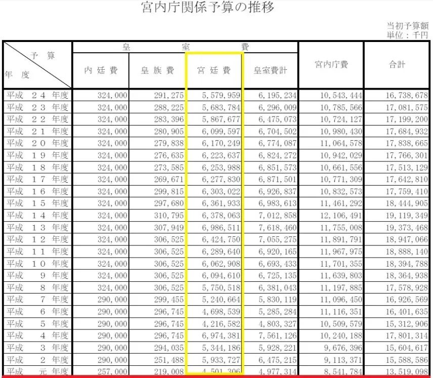 更有好事的網友還從日本宮內廳官網上扒出了從昭和年度到平成年代的“宮廷費”預算推移。