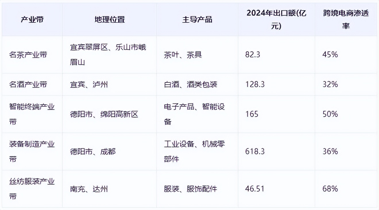 四川省依託"名茶產業帶"、“名酒產業帶”、“裝備製造產業帶”、“智能終端產業帶"等特色產業集羣,形成跨境電商出口的核心支撐。