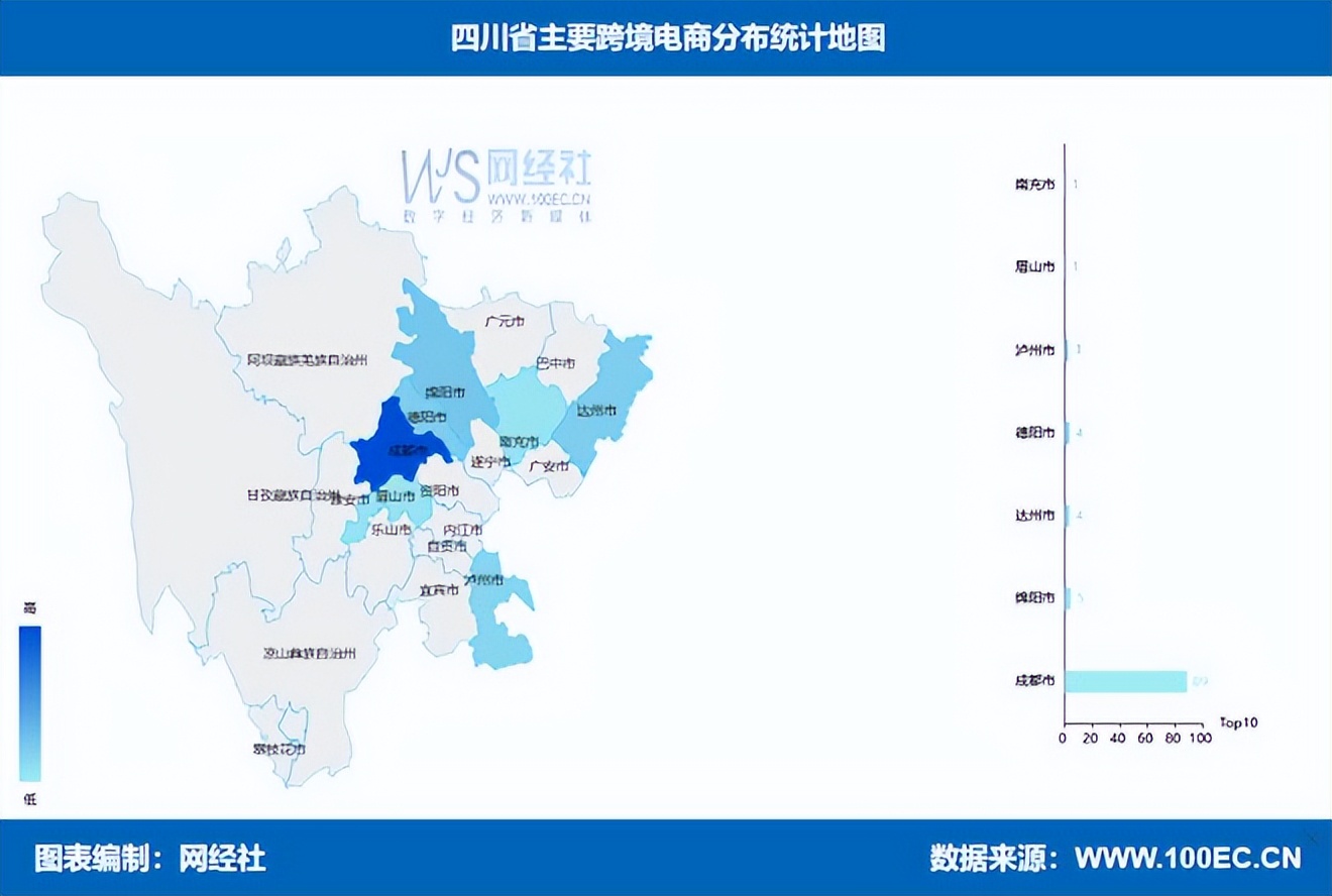 四川省主要跨境電商有107家,其中主要分佈在成都市共有89家,剩餘分佈在綿陽市、達州市、德陽市、瀘州市、眉山市、南充市等地。