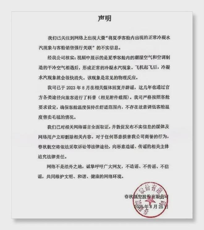 然而,春秋航空的聲明指出,視頻中展示的是夏季客艙內潮濕空氣和空調製造的乾冷空氣相遇後形成的正常冷凝水汽現象,飛機起飛後這種現象很快就會消失,這是常見的物理反應。公司已於2023年8月在相關媒體回覆並闢謠,多年來也通過官方途徑向旅客進行科普,並且嚴格按照客艙要求設定温度,確保客艙温度保持在舒適範圍內,不存在故意調低客艙温度售賣毛毯的情況。目前,春秋航空已對相關網絡謠言全面取證,並敦促發布不實信息的媒體及網絡用户立即刪除相關內容,對於惡意損害公司商譽的行為,將依法採取訴訟等法律途徑追究責任。